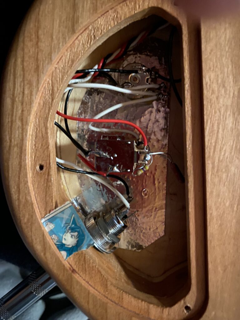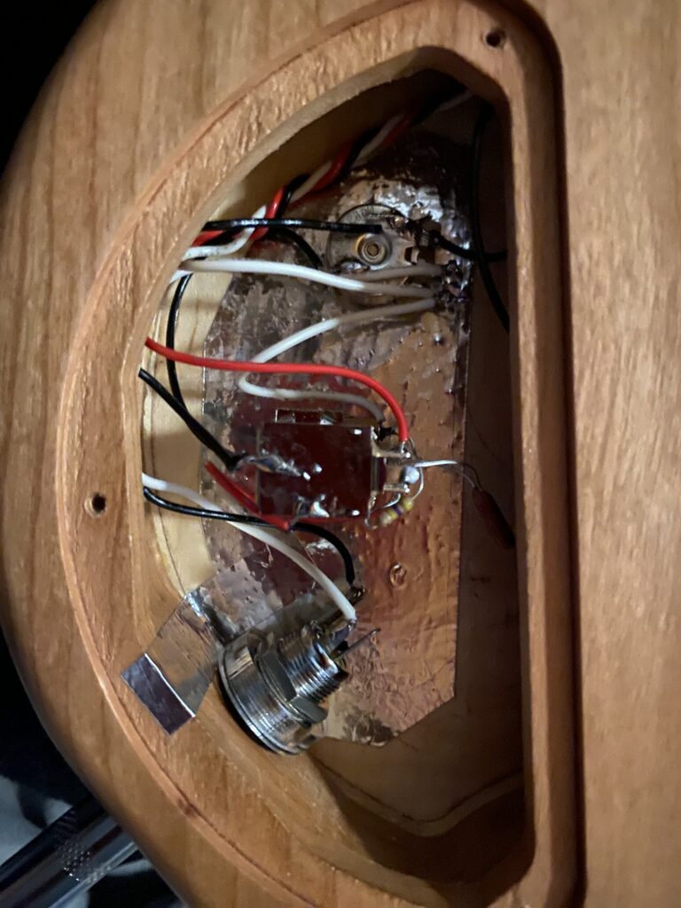 Ok, so fresh cable in, problem still persists. Next I thought that because I’m laying in bed, I maybe I could be putting an unusual pressure on the back plate that caused the block of the Tone knob to hit the foil and cause some sort of loop. So I put tape on top of that rectangle too. No change. I was out of ideas, so it was time to ask the Uke Tribe if they had any ideas. So I grabbed my phone and made another video to show what was happening.
